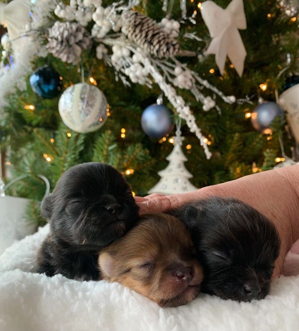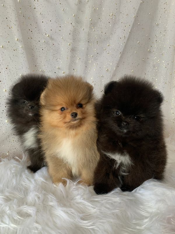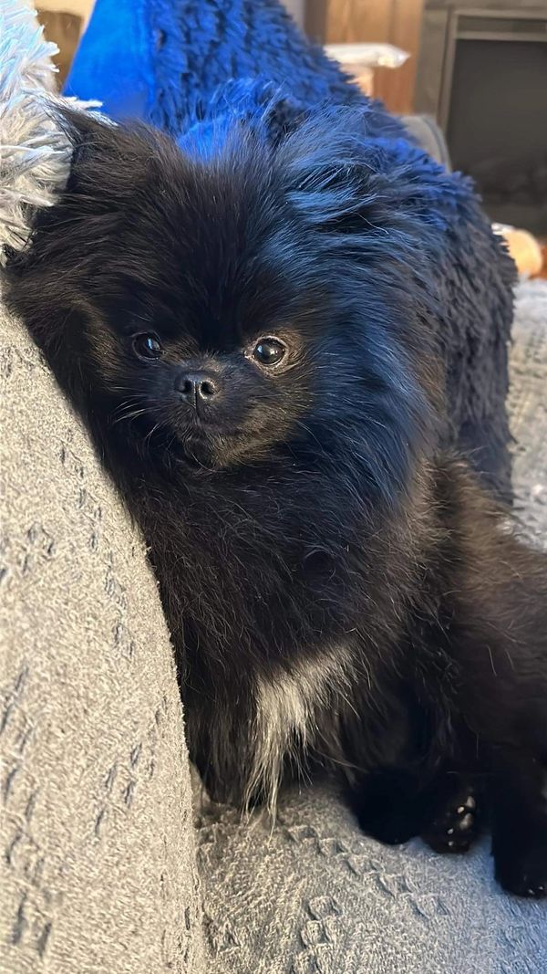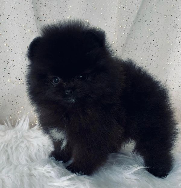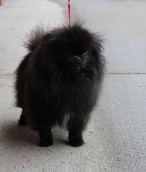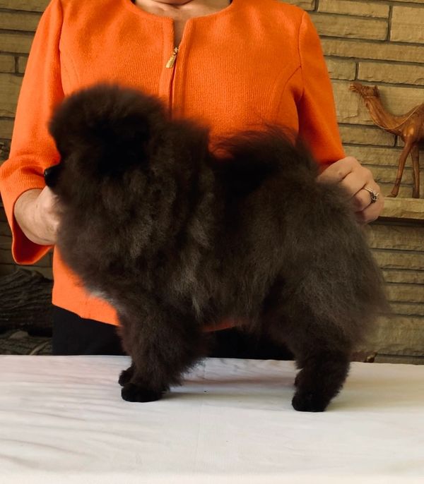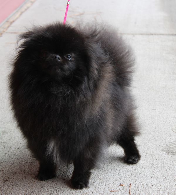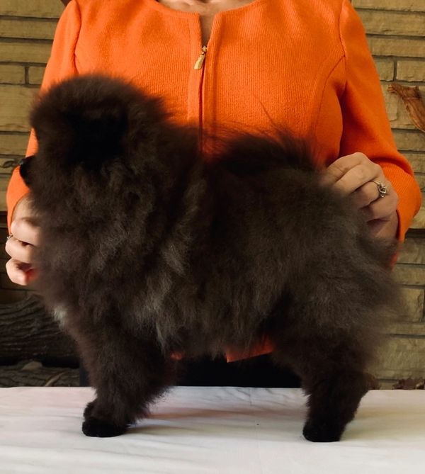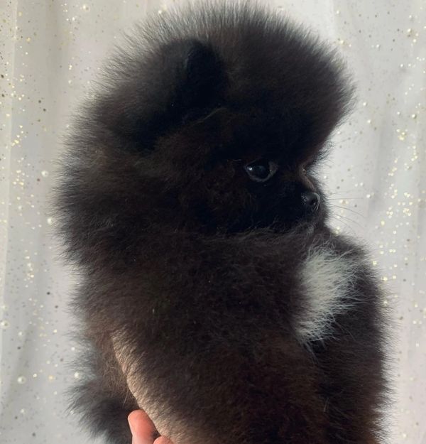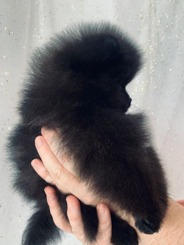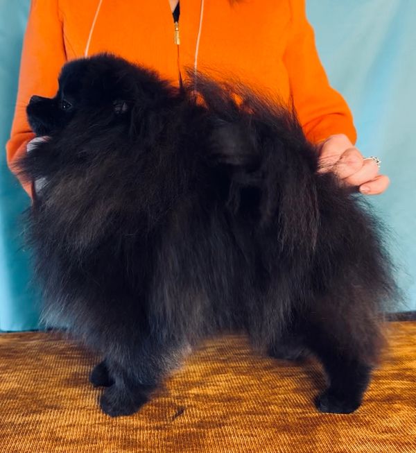 Desi is a stunning black Pomeranian born right here at GemPoms, sired by our all-time favorite, Rowdy. Weighing a perfect 6 lbs, she is the epitome of the compact and square build we strive for in our program. Desi is draped in an incredibly thick, long, and sleek jet-black coat that perfectly complements her expressive face and beautiful almond-shaped eyes.